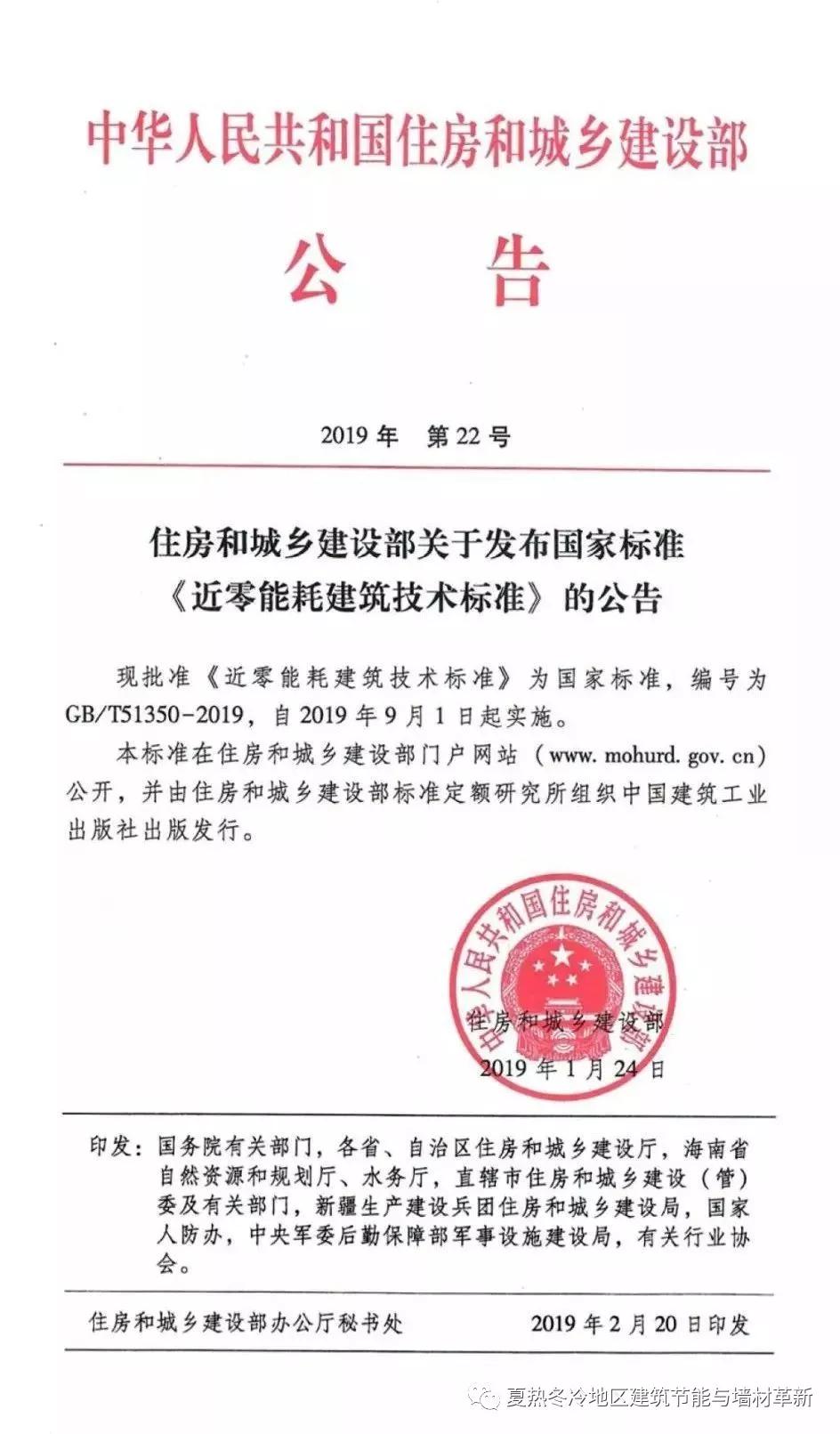 2019年1月24日,住房和城鄉(xiāng)建設(shè)部發(fā)布了“關(guān)于發(fā)布國(guó)家標(biāo)準(zhǔn)《近零能耗建筑技術(shù)標(biāo)準(zhǔn)》的公告”,《近零能耗建筑技術(shù)標(biāo)準(zhǔn)》GB/T51350-2019自2019年9月1日起實(shí)施。