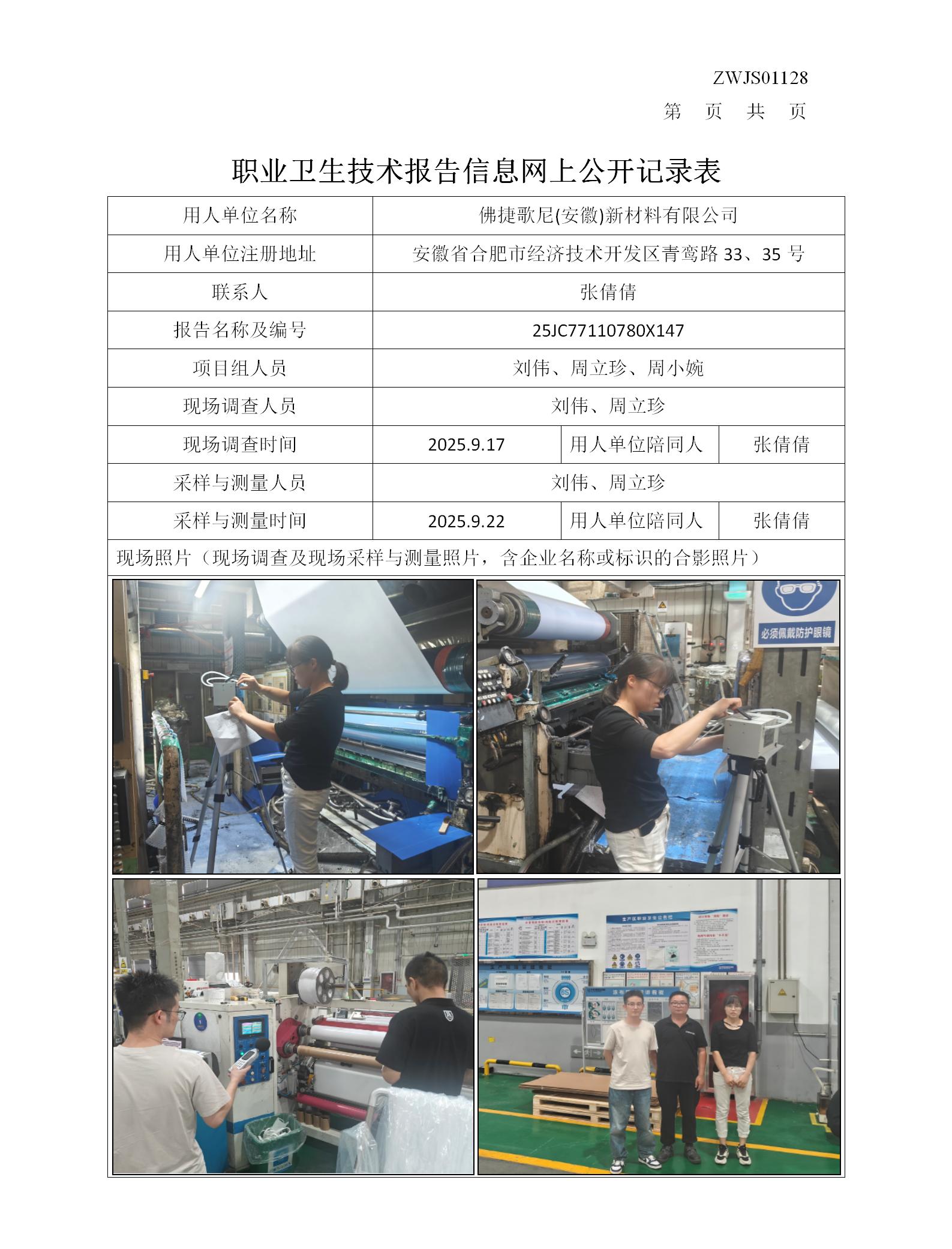 佛捷歌尼(安徽)新材料有限公司職業病危害因素定期檢測報告