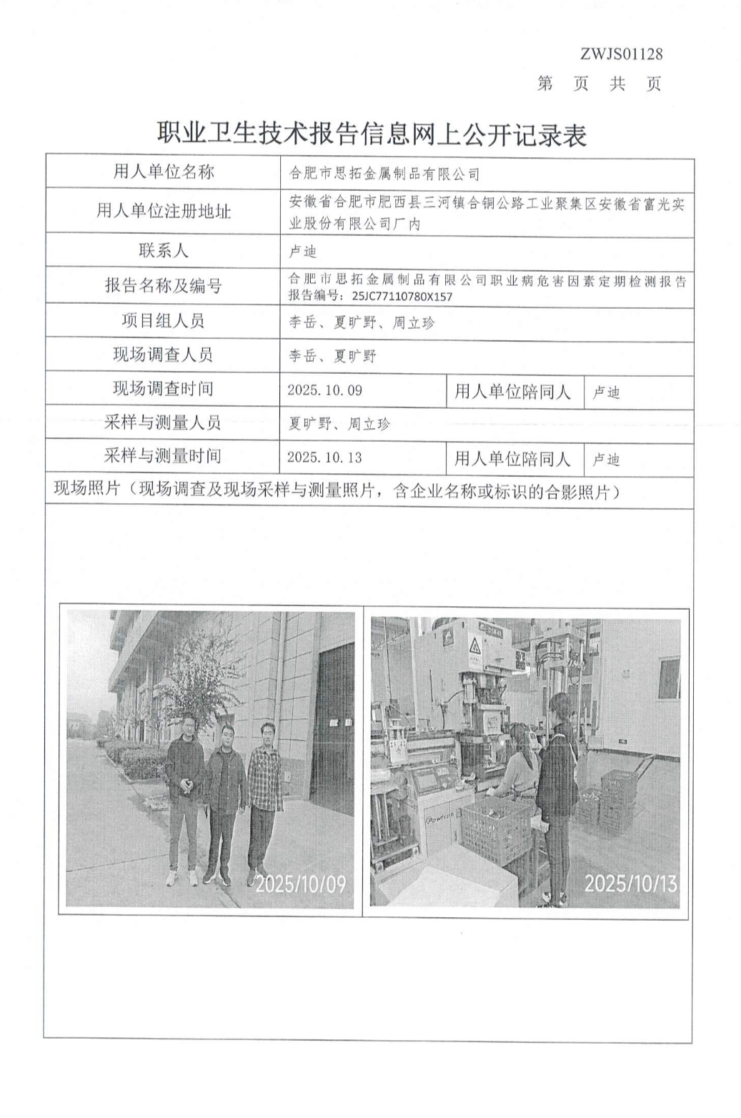 合肥市思拓金屬制品有限公司職業(yè)病危害因素定期檢測報(bào)告