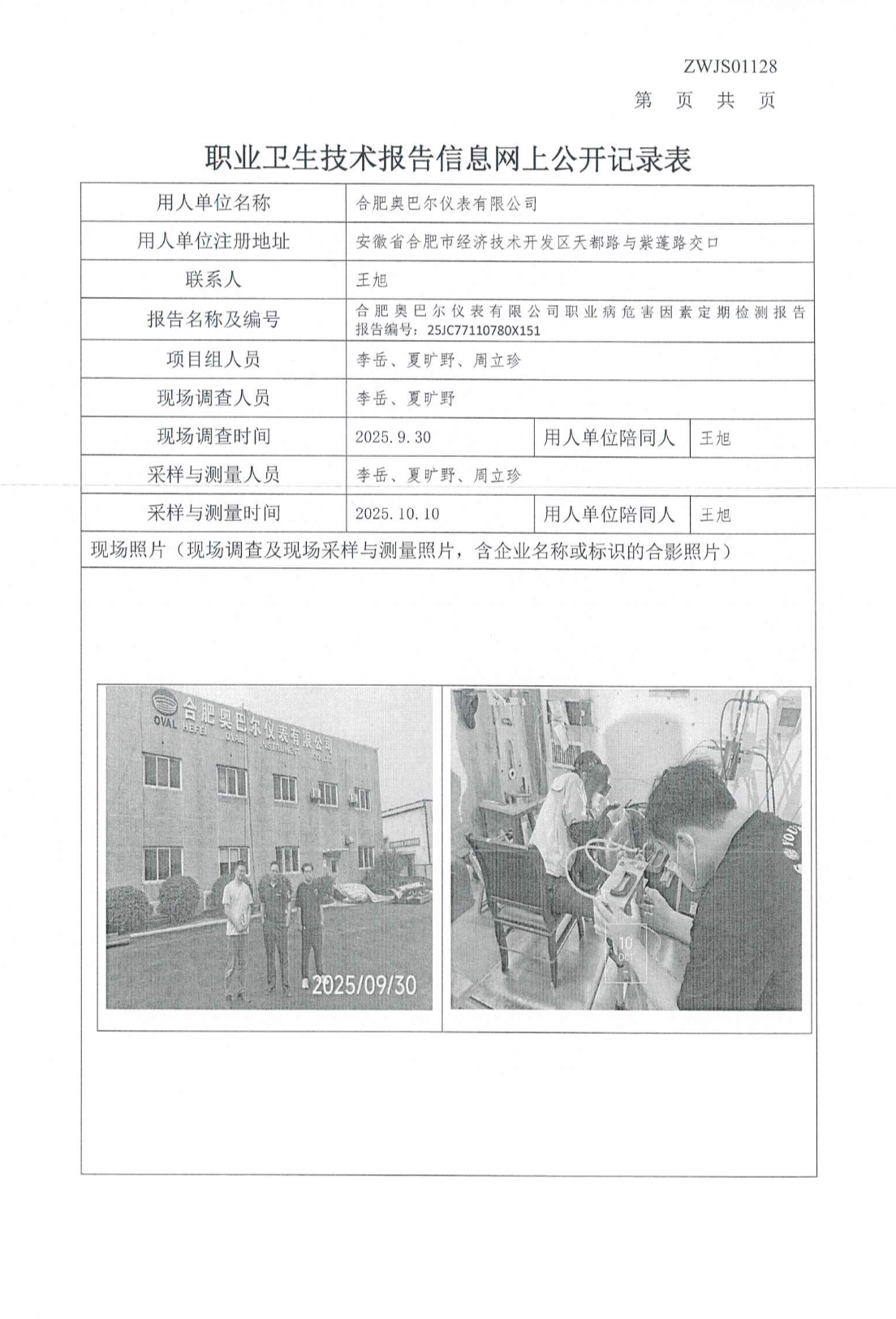 合肥奧巴爾儀表有限公司職業病危害因素定期檢測報告