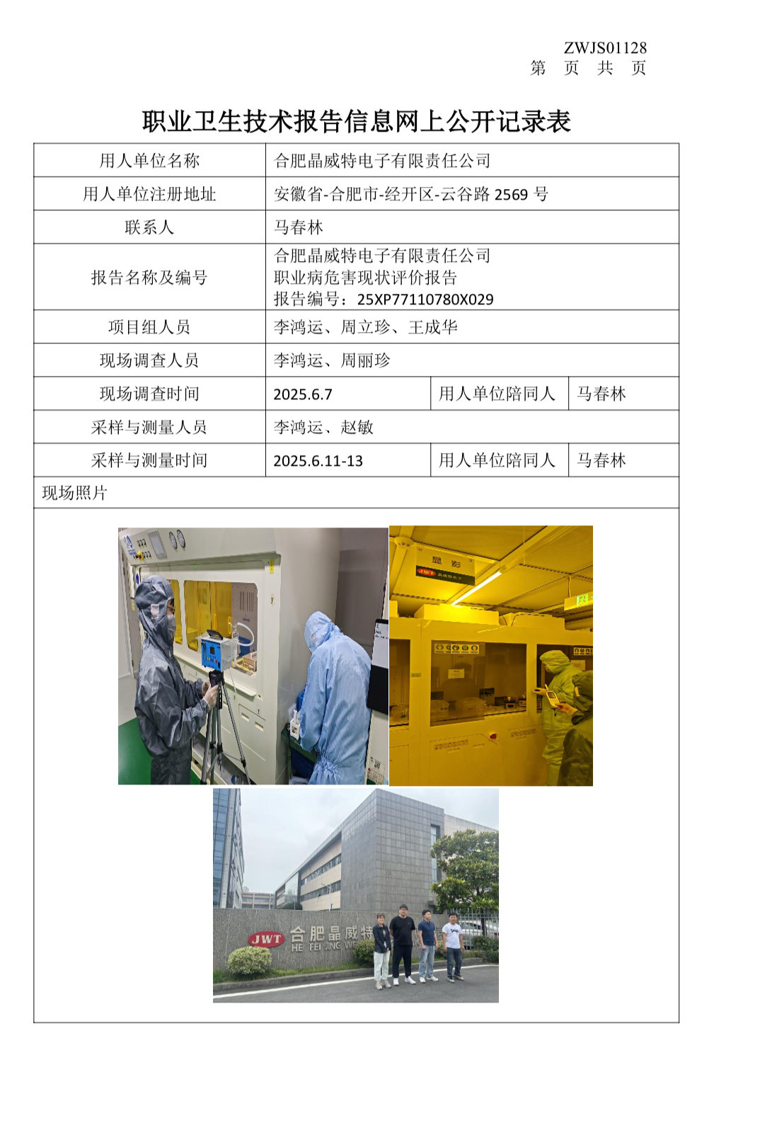 合肥晶威特電子有限責任公司職業病危害現狀評價報告