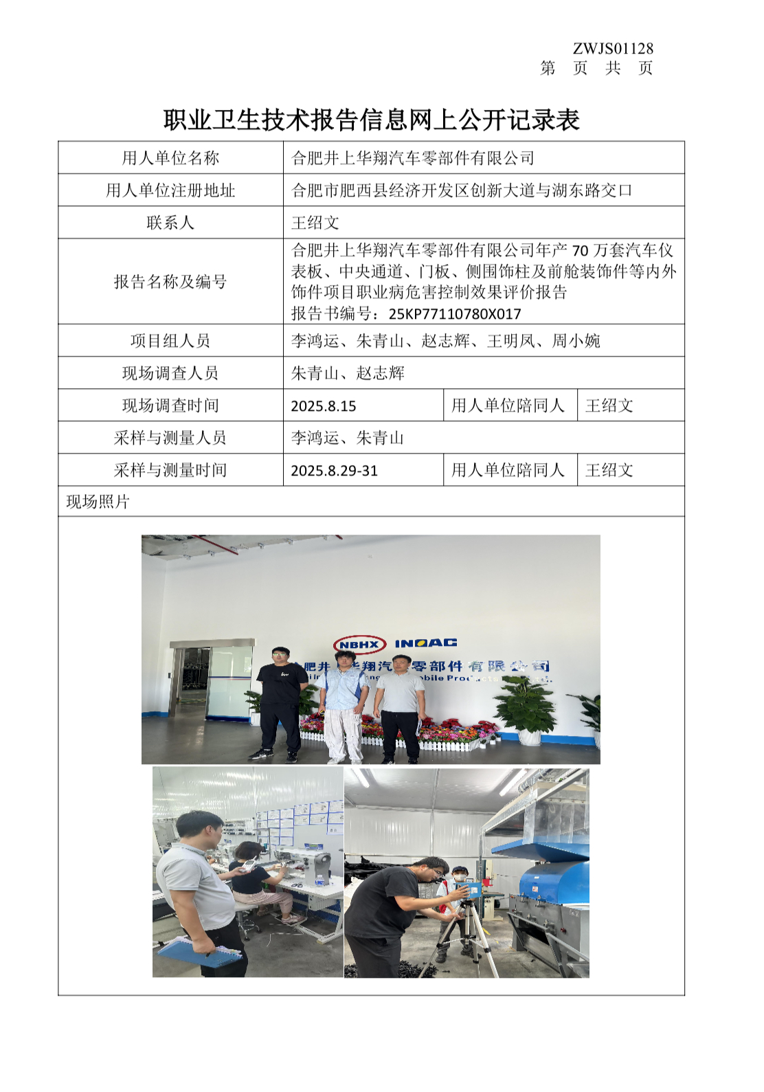 合肥井上華翔汽車零部件有限公司年產70萬套汽車儀表板、中央通道、門板、側圍飾柱及前艙裝飾件等內外飾件項目職業病危害控制效果評價報告