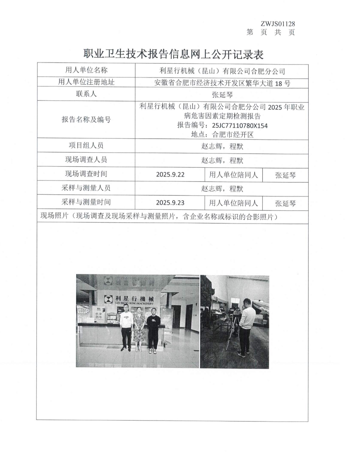 利星行機械(昆山)有限公司合肥分公司2025年職業病危害因素定期檢測報告