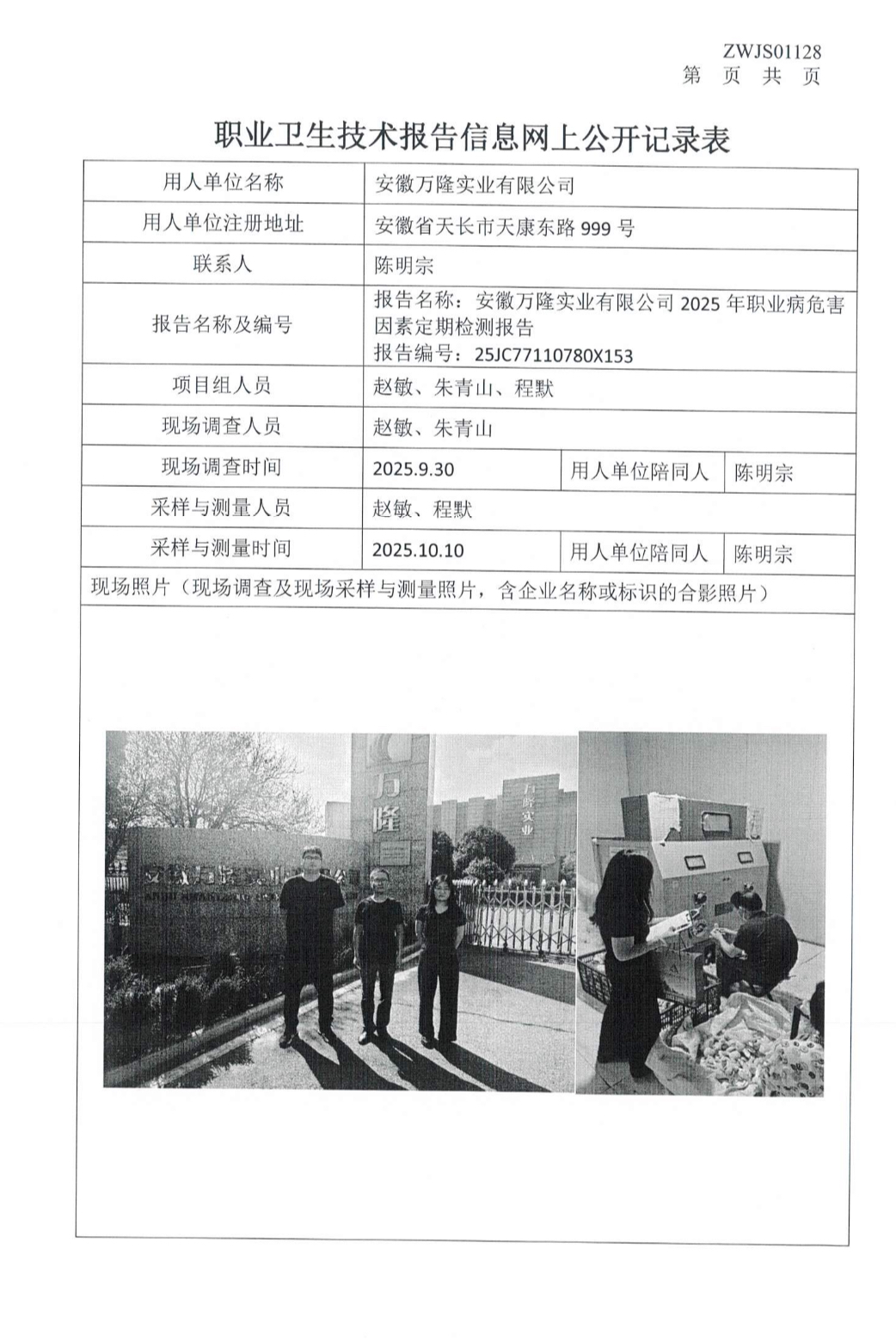 安徽萬隆實業有限公司2025年職業病危害因素定期檢測報告