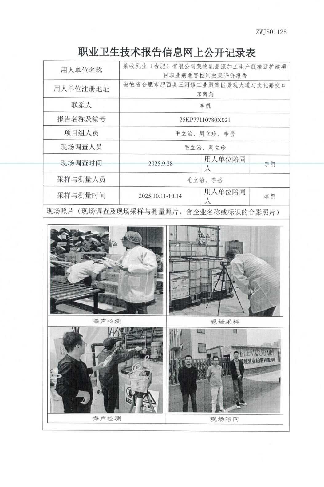 萊牧乳業(合肥)有限公司萊牧乳品深加工生產線搬遷擴建項目職業病危害控制效果評價報告