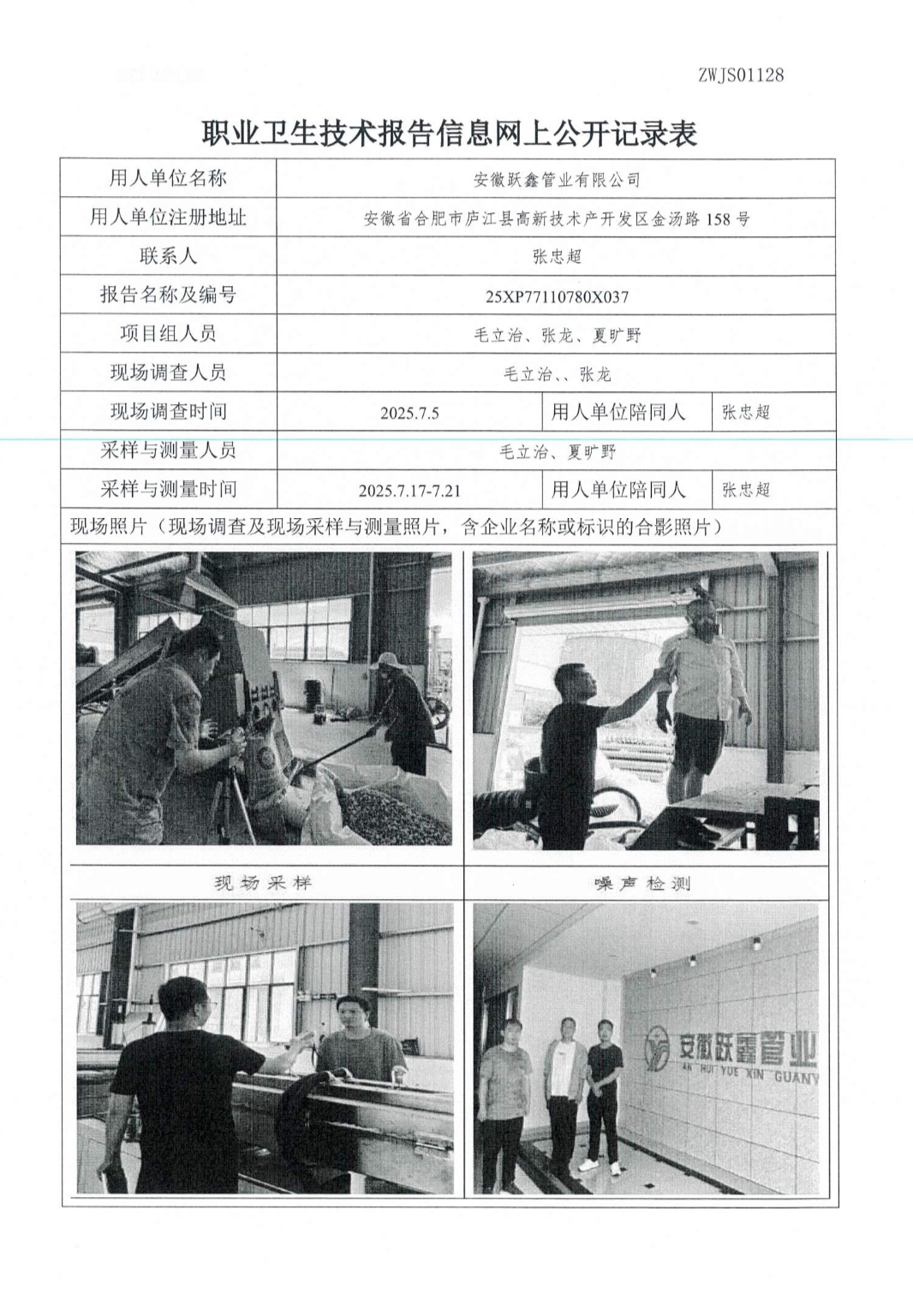 安徽躍鑫管業(yè)有限公司職業(yè)病危害現(xiàn)狀評價