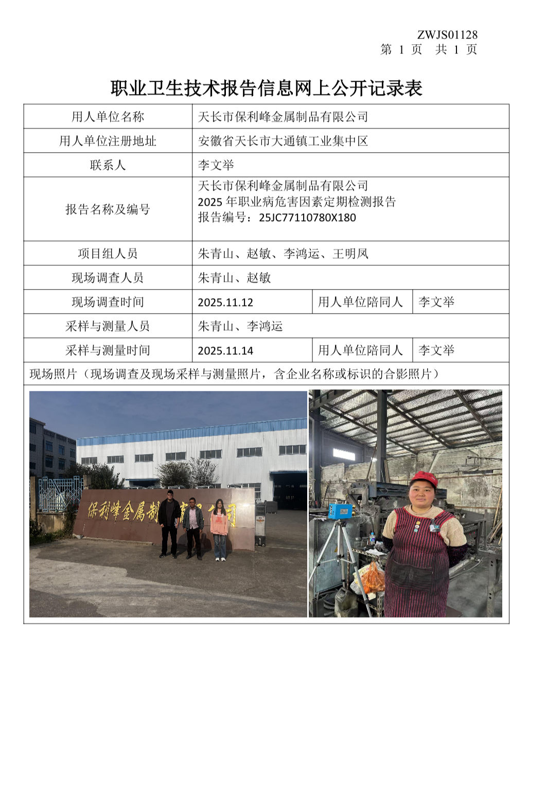 天長市保利峰金屬制品有限公司2025年職業(yè)病危害因素定期檢測報告