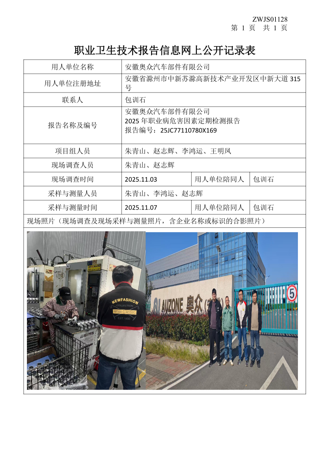 安徽奧眾汽車部件有限公司2025年職業病危害因素定期檢測報告