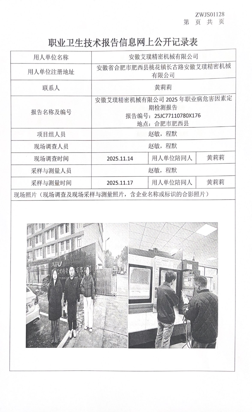 安徽艾璞精密機械有限公司2025年職業病危害因素定期檢測報告