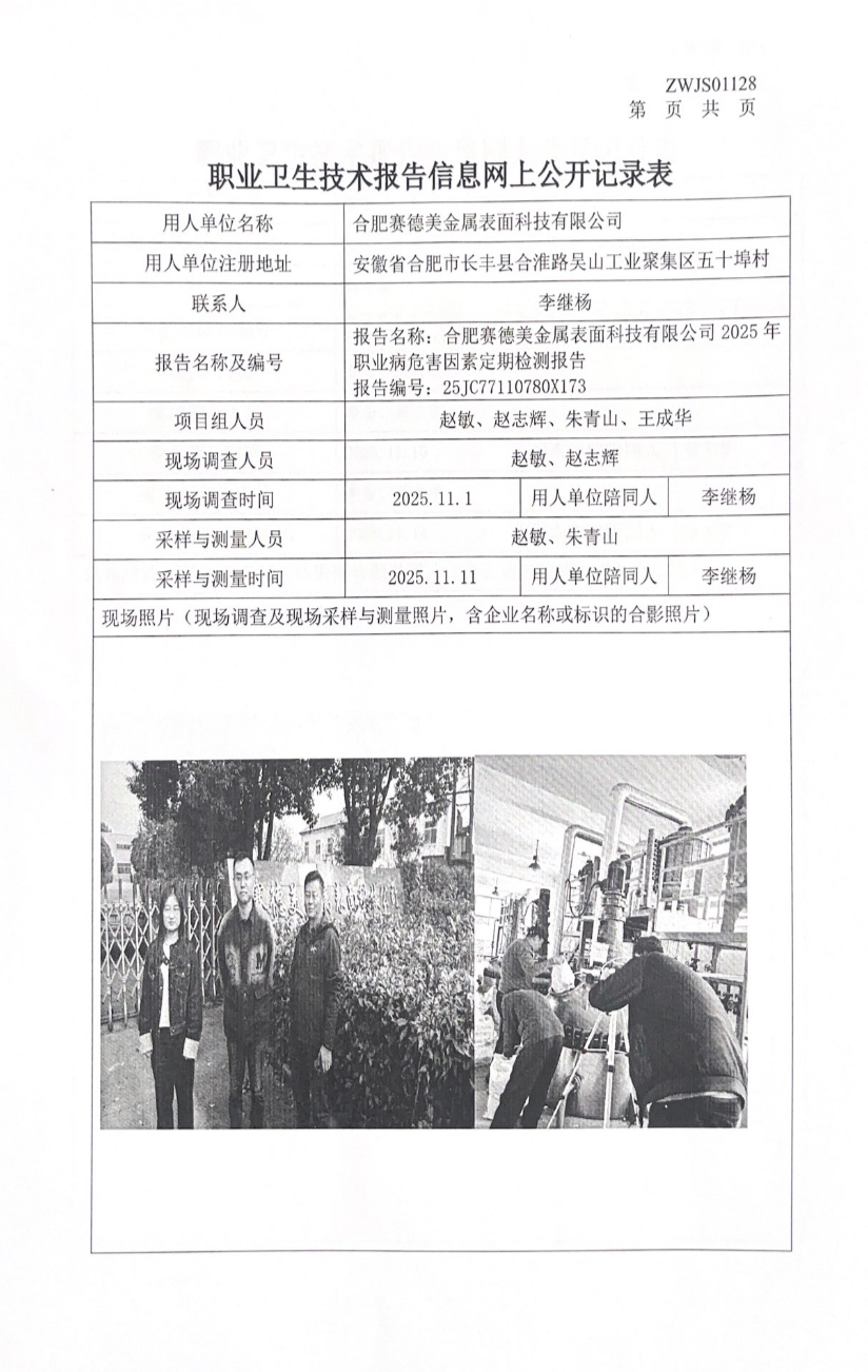 合肥賽德美金屬表面科技有限公司2025年職業病危害因素定期檢測報告
