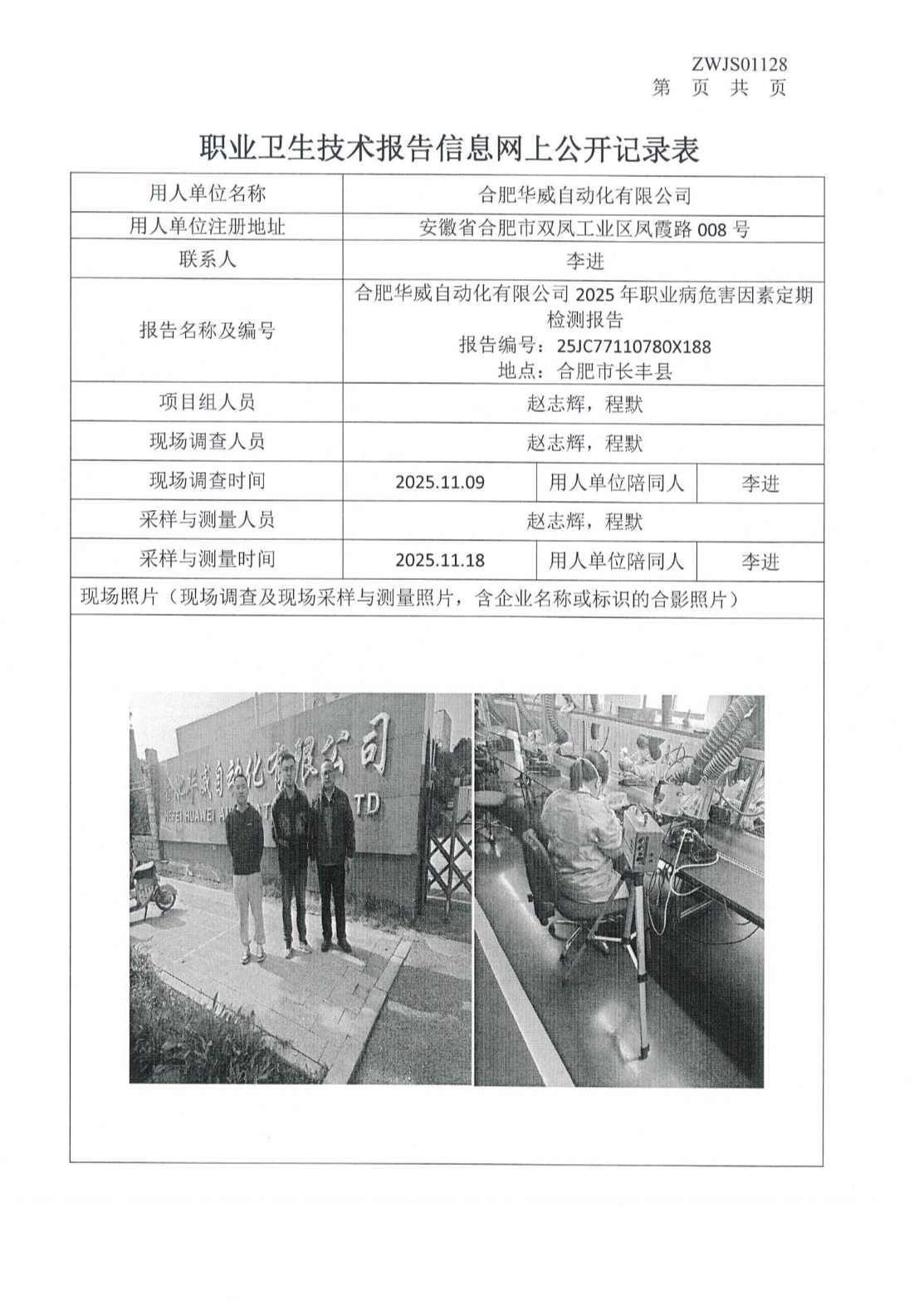合肥華威自動化有限公司2025年職業(yè)病危害因素定期檢測報告