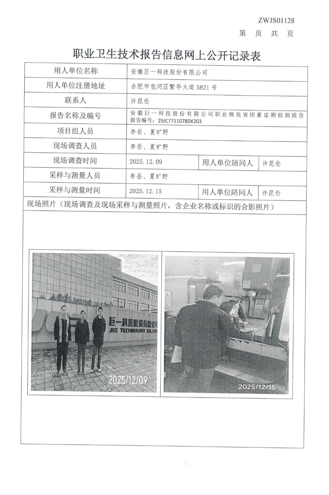 安徽巨一科技股份有限公司職業病危害因素定期檢測報告