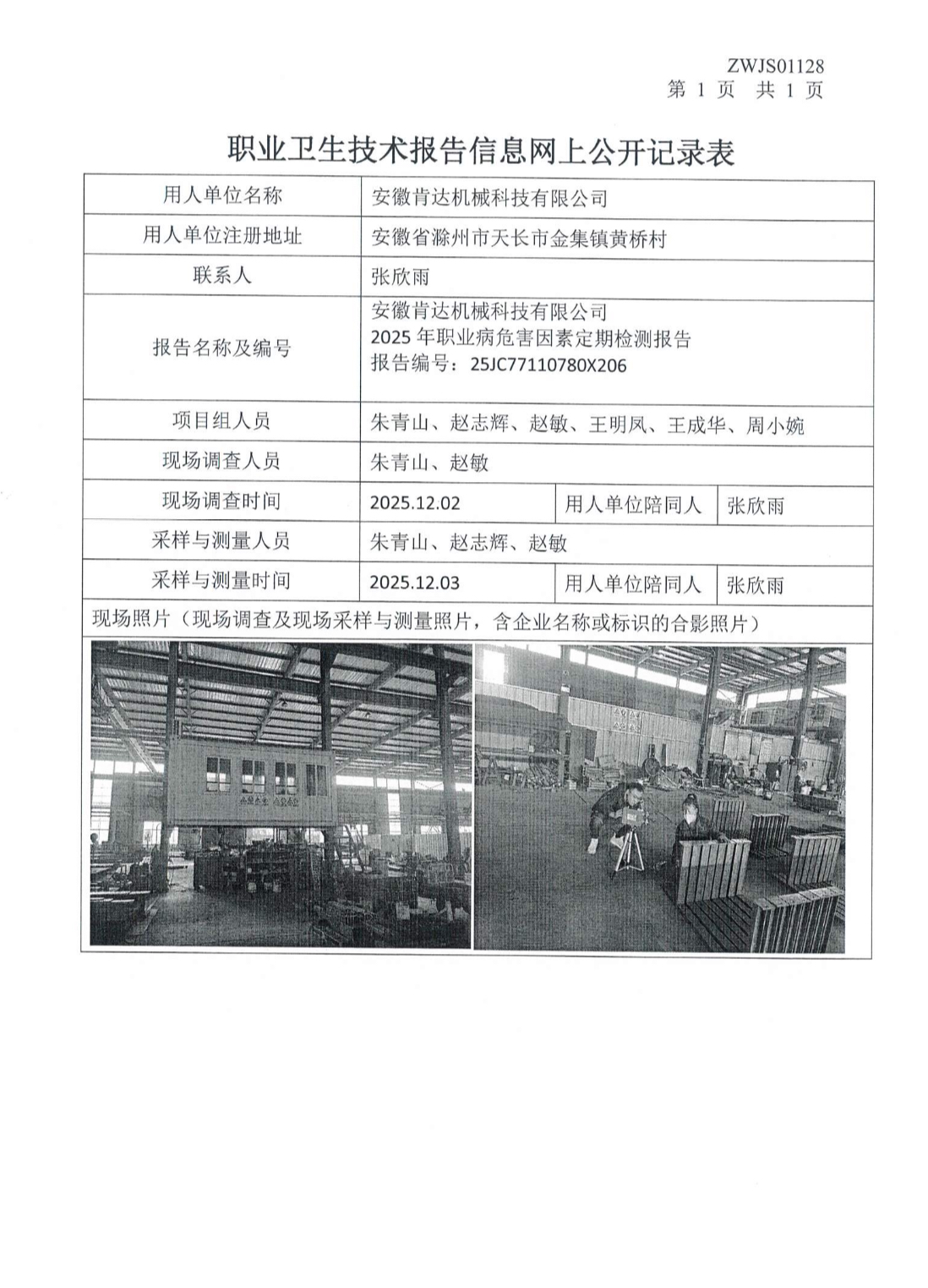安徽肯達機械科技有限公司2025年職業(yè)病危害因素定期檢測報告