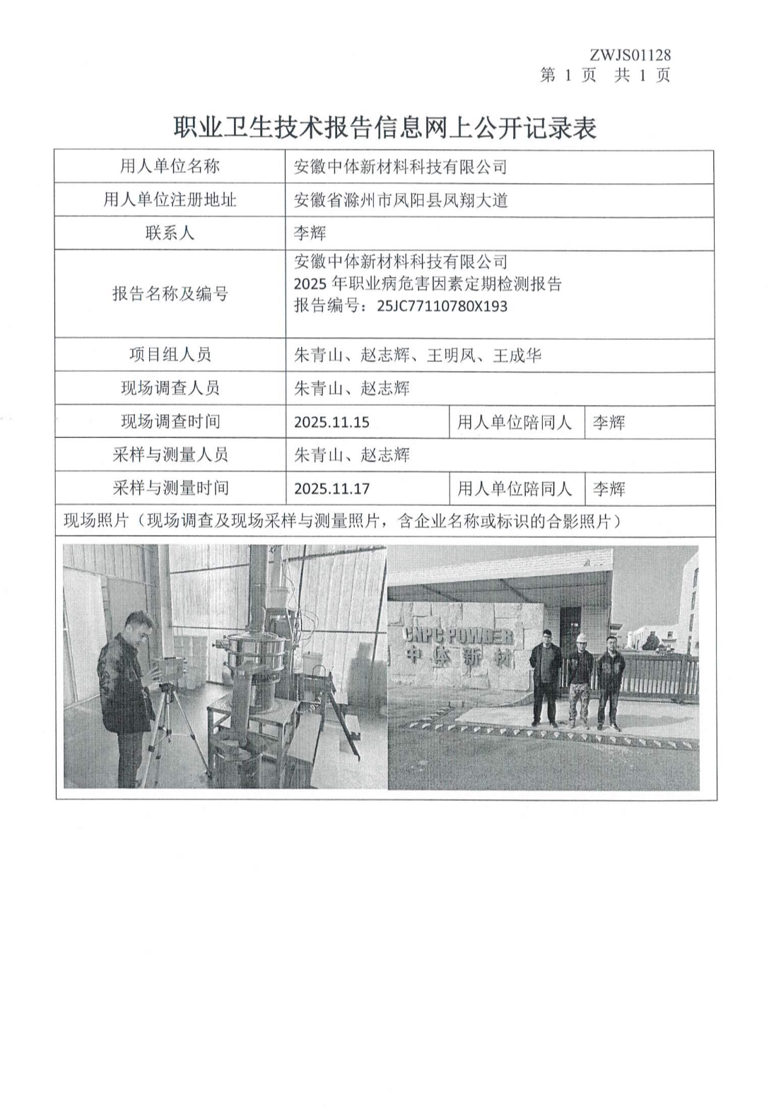 安徽中體新材料科技有限公司2025年職業(yè)病危害因素定期檢測報告