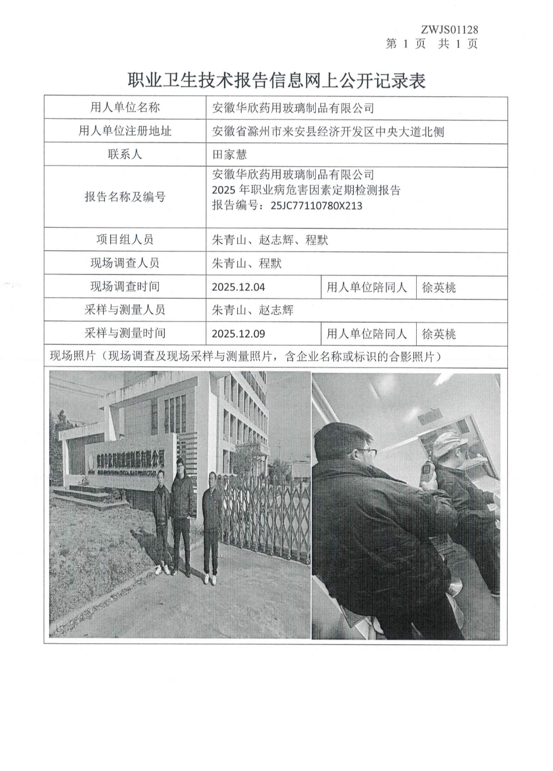 安徽華欣藥用玻璃制品有限公司2025年職業病危害因素定期檢測報告