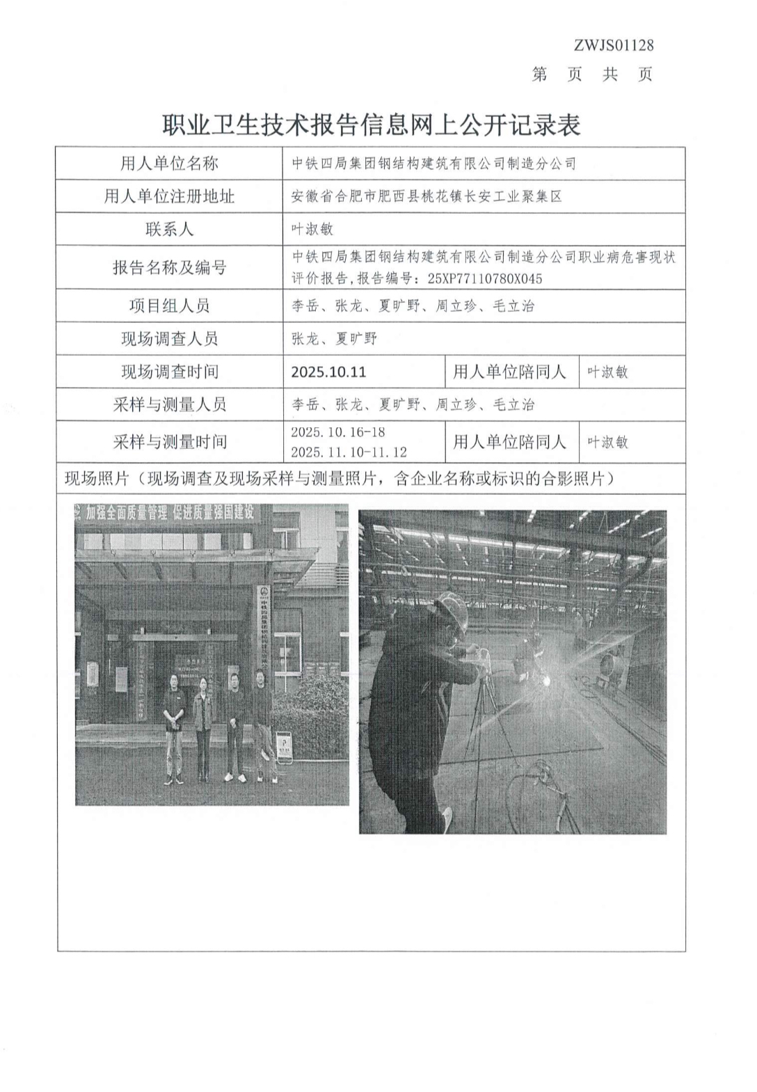 中鐵四局集團鋼結構建筑有限公司制造分公司職業病危害現狀評價報告