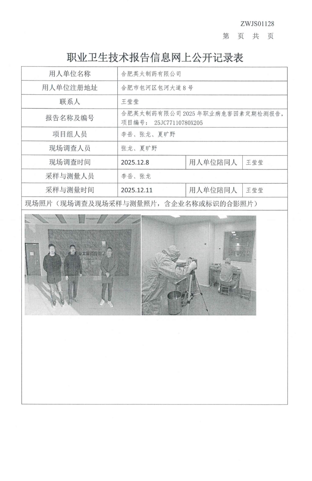 合肥英太制藥有限公司2025年職業病危害因素定期檢測報告