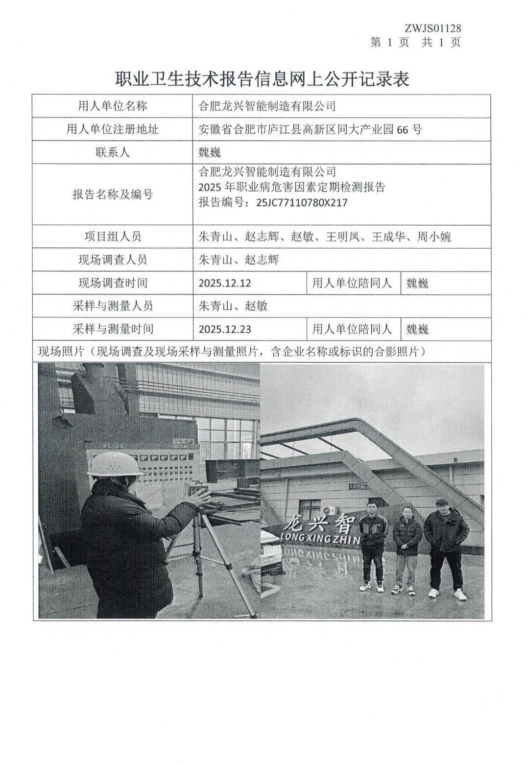 合肥龍興智能制造有限公司2025年職業(yè)病危害因素定期檢測報告
