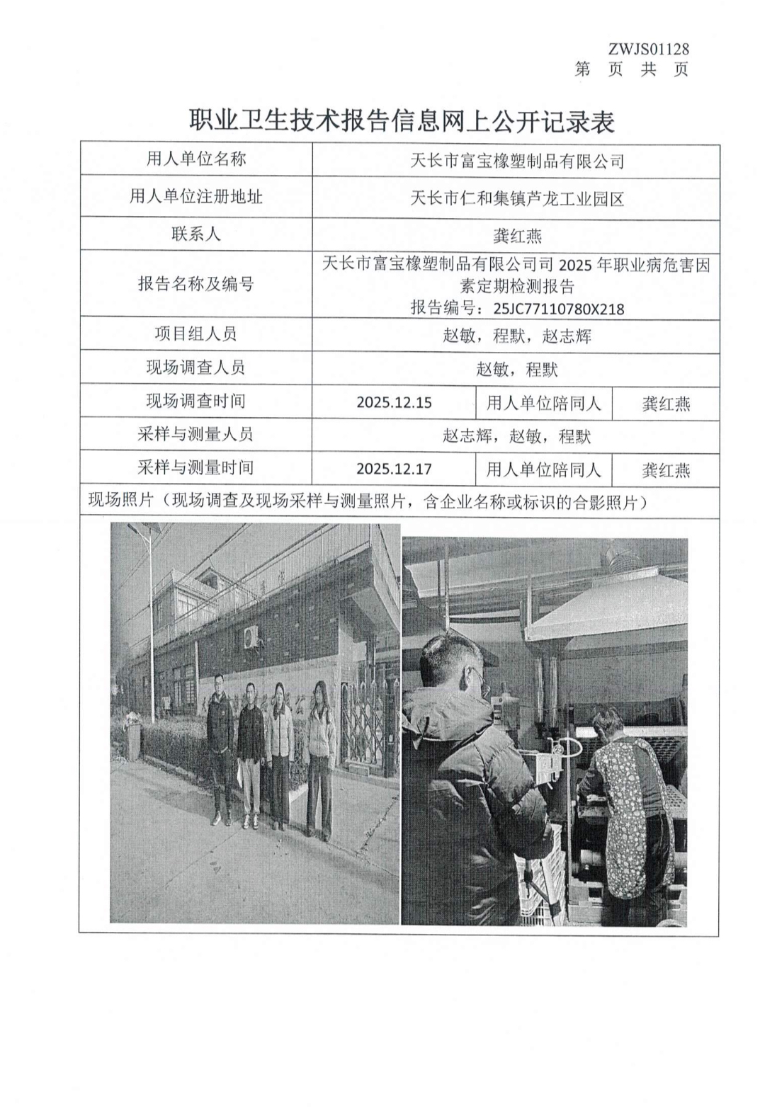 天長(zhǎng)市富寶橡塑制品有限公司2025年職業(yè)病危害因素定期檢測(cè)報(bào)告